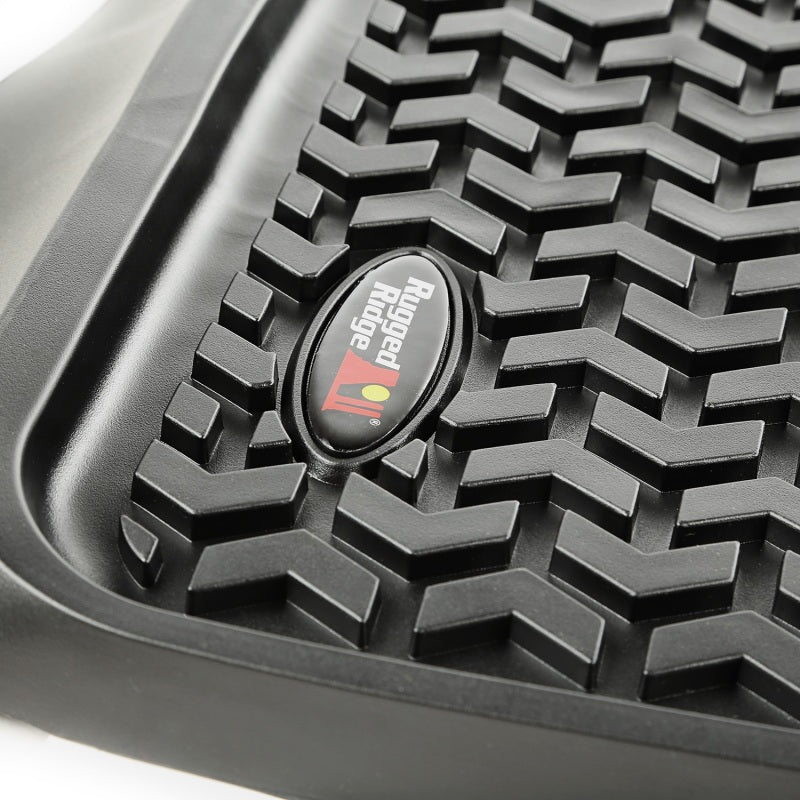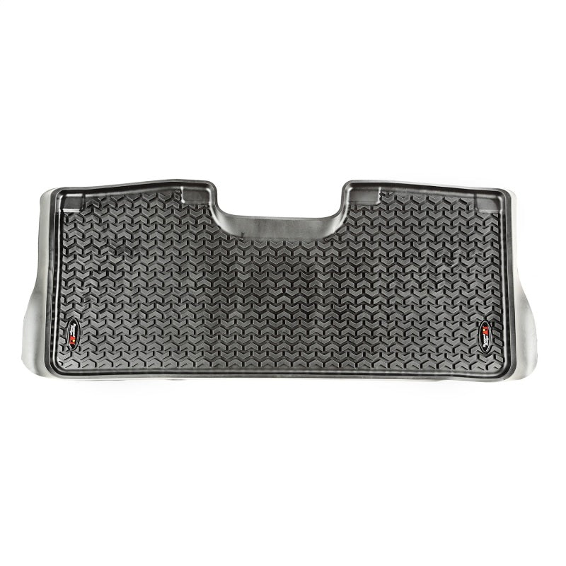 Need an affordable solution to keep the floors of your vehicle looking factory fresh? Rugged Ridge has you covered with this custom-fit black rear All-Terrain floor liner. Featuring a durable OE-quality thermoplastic material that can withstand the rigor of daily abuse; each liner is perfectly contoured to your vehicle s floor for precise secure fitment (floor hook attachment where applicable). The raised lip captures spills; water and debris; keeping your interior pristine. Features a chevron-shape; patented; deep-tread technology Pat Nos. 8;163;369/D627; 285.